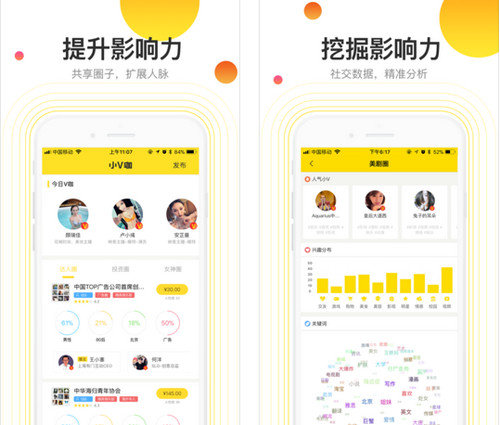 小V咖基于社交大数据的精准匹配和长尾影响力的人工智能算法,深度挖掘个人影响力。帮助社交平台的每个普通小V,实现社交影响力的认证、提升和变现。