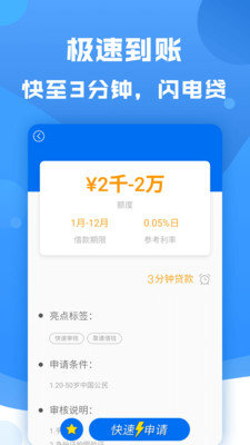 1、贷款极速:一键申请,极速审核,快至3分钟到账,极速贷款不等贷!
