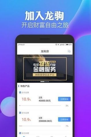 龙驹贷是一款为用户提供优质的贷款服务的软件,最大的优势就是下款快,致力于为物流行业小微用户(货主、司机等)提供网络借贷中介信息服务,公平、透明、稳定、高效的借贷,及时的为您解决资金难题,感兴趣的用户赶快来下载使用吧。