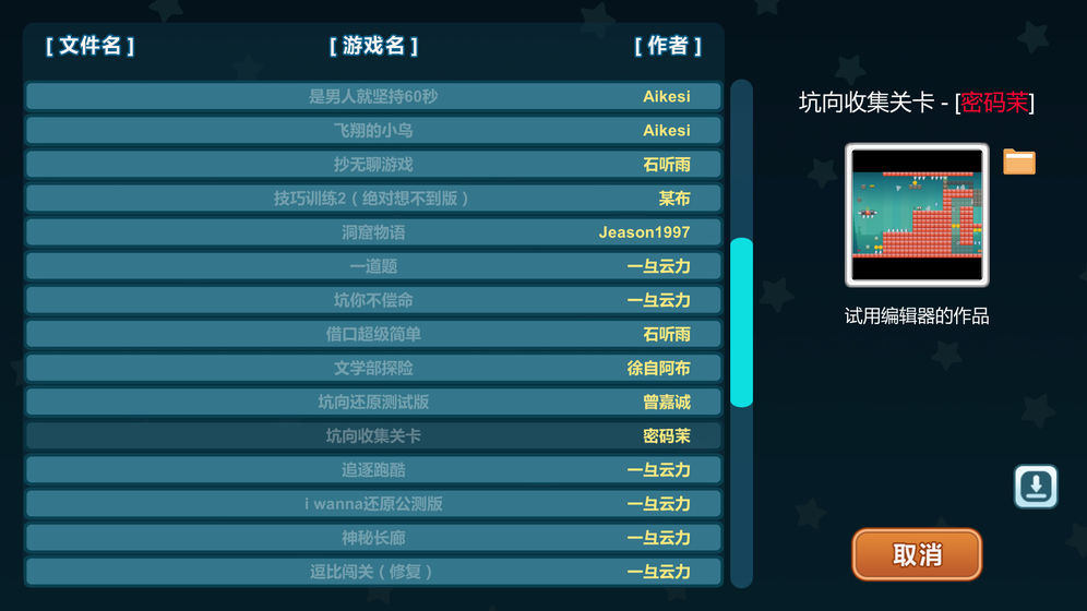 创造与挑战是一款可以自己DIY关卡的游戏,目前关卡共38个,分为3个章节(每个章节包括6个普通关卡、3个坑向关卡、3个挑战关卡),以及2个特殊关卡。感兴趣的小伙伴可以来下载创造与挑战体验一下哦!