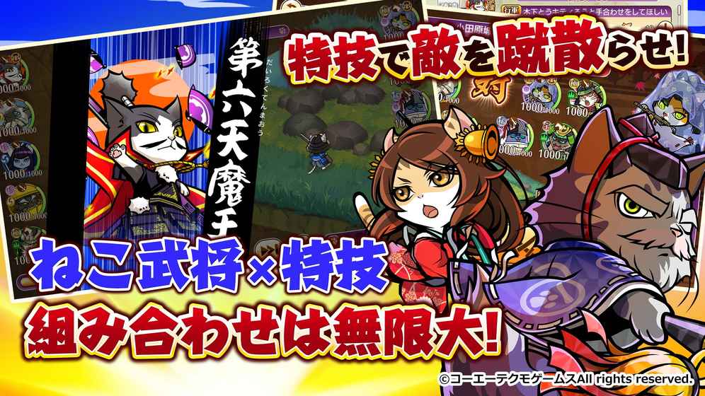 由光荣特库摩公司研发的集战争策略、收集养成于一体的游戏,现在登录手机平台!除了继承了光荣优良的“策略基因”之外,集合单机、客户端网游、页游、SNS游戏的诸多玩法特性,创新出独具特色的战场系统和经济交互系统。故事发生在群雄割据的战国时代。由喵将们挑起的的战火席卷各地,并迅速地改变着当时的势力分布形式。在喵将的争斗中,暂时由尾张的第六天魔王织田信喵将这个天下纳入了手中。在北方,独眼喵将咪达政宗征服了无数的骑兵军团,名声大振,他的目标是织田信喵的首级,以及天下一统。而在明智喵秀发动谋反之后,喵臣秀吉等迅速会师讨伐,三日天下,数易其主!当时比较有实力的喵将们以成就天下霸业为目标,导致持续不断地发生着大大小小的战役。这其中包括了甲斐的武田喵玄、真田幸咪;越后的上杉喵信;近江的浅井喵政;安芸的猫利元就;土佐的长宗猫部元亲;三河的德喵家康……时值战国乱世,欺骗,背叛,下克上,处处皆是之乱世,而不受制于乱世,随心而战之吾等,人称【御雇众】,吾等心之所向,乃至高之名声【日本第一御雇众】,吾等拥强烈羁绊,一同四处征战,【若欲战胜,则呼吾等】,此为点缀战国之另一传说。虽然,吾等只是一群喵…