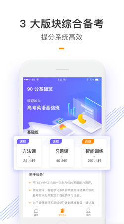 在朗播高考英语APP的科学训练体系之中,学生先通过系统测评得到数据化能力分析,对自身学力形成了解,随后系统会为学生智能推荐90分、120分、150分三档学习计划选择,随后根据朗播高考英语APP制定的学习规划,完成针对自身能力漏洞的课程学习与训练。