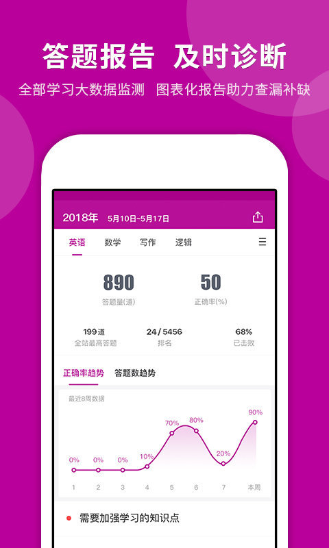 每次作题,系统都详细记录,自动生成答题报告,答错量、正确率、全站答题排名、正确率趋势、错误率趋势一目了然,需要加强的知识点,系统自动推荐。