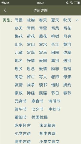 2、整个界面相当的简洁,划分成主界面的推荐以及名句和作者还有名著等划分,百位作者、百种分类以及多朝代多形式的详细划分;