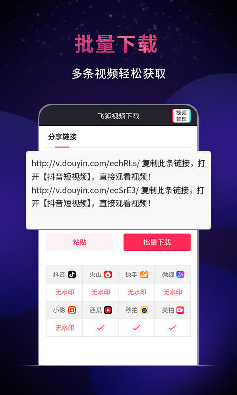 抖音视频去水印:打开飞狐视频下载器,输入抖音视频地址,点击批量下载即可。
