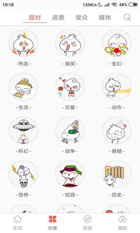 热血、搞笑、玄幻、生活、恋爱、动作、科幻、悬疑、恐怖、校园、历史、穿越、后宫、都市、萝莉、漫改、修真、耿美、百合、霸总、古风、武侠、真人。