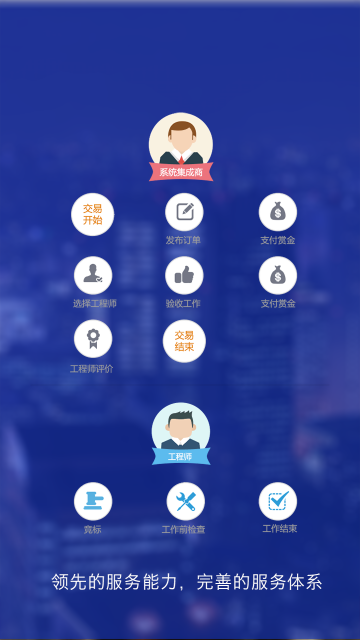 线上快捷的发单、抢单,线下完成技术支持。并将运维需求用户、系统集成服务商、IT技术工程师三者进行连接。