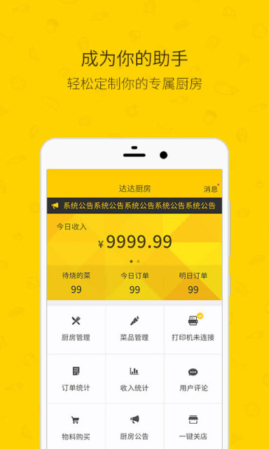 帮助你快速地接收、处理订单,随身管理厨房。主要功能有接受并处理用户订单、自助开店、随时调整营业状态、管理菜品库存、查看厨房经营状况、自助结款等。