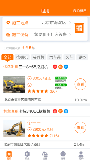 承租人可直接通过网站及手机App直接提交预约需求,系统将预约需求推送给周边拥有此设备的机主,机主会向承租人报价,平台设备租赁价格普遍低于普通设备租赁价格。