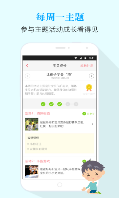 家长与宝贝共同参与每周主题、每日活动,让宝贝的家庭生活与学习更加丰富、成长更明显