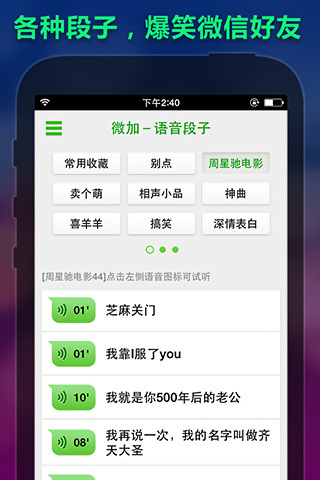 4、语音表情:不仅有历年春晚,小品,电影,动漫,神曲等耳熟能详的爆笑经典语音,而且又各种卖萌卖腐有内涵的语音段子,有星爷电影的爆笑台词让你的聊天变得更有趣,也有黄海波的深情告白,让你和女神之间只有一个微加的距离。