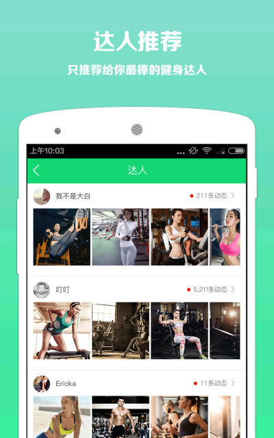 用户交流地,分享成果,健身打卡。这里是健身爱好者们的自留地,记录每一天的蜕变,记录每一点的成长,分享每一滴的进步,在这里,你不孤单,你有所有人。