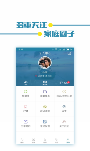 6.【我的健康】加入自己的健康圈,管理家庭成员,查看家庭成员实时健康动态,查看个人问诊和检测记录,了解易秒健康。