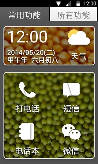 主要功能:大字体,大图标,图标分类,图标固定,常用功能与所有功能分开管理;快捷报号;一键求救;流量开关;天气;手机自带的所有功能。