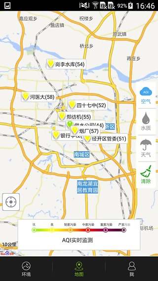 5.动态地图展示空气质量:在地图上,直接展示空间范围空气质量实时分布情况(包括AQI 、PM2.5 、PM10、 NO2等指标),实现了实时空气质量渲染图,信息更直观;