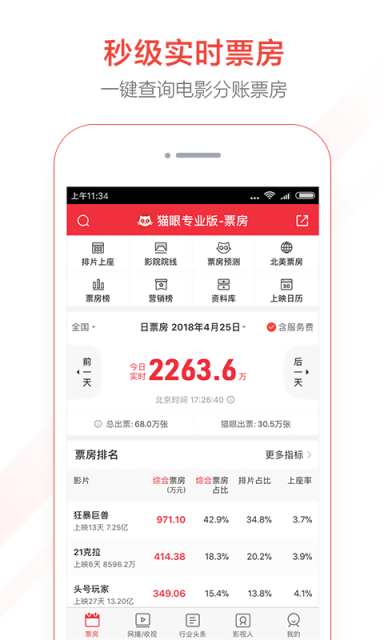 3.秒级实时票房:国内秒级实时票房查询工具,每分每秒掌握电影市场实时动态;