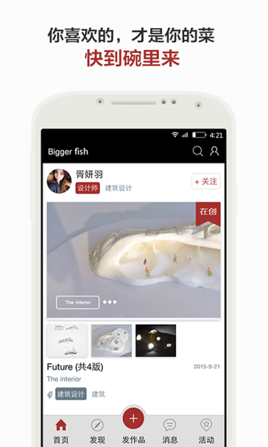 BiggerFish】 是艺术设计交流教育领域的学习社交产品,国际国内的设计师和艺术爱好者、工作者、学习者可以在这里分享自己的作品,与大咖们进行互动点评,学习和提高。