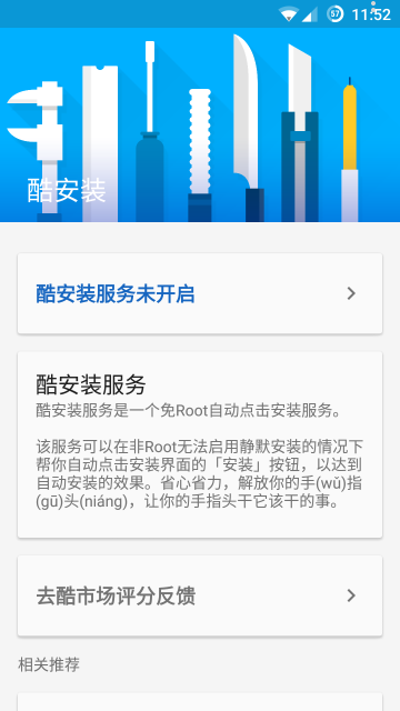 酷安装帮你办:在apk下载完点击或自动弹出安装界面之后帮你自动完成“下一步”、“安装”、“完成”等点击步骤,当然也能帮你完成卸载过程中的自动点击,无需root权限。