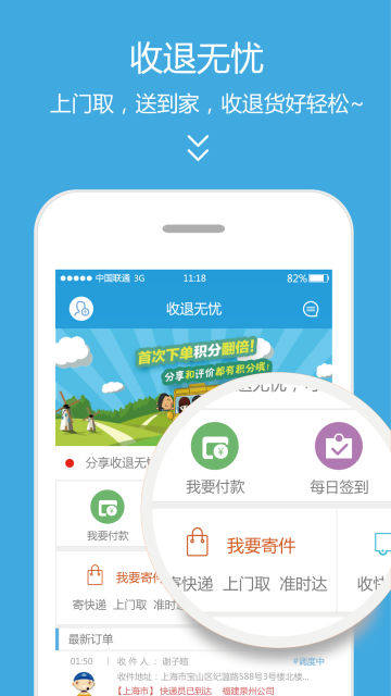 收退无忧,是一款收货退货的应用平台。发货人、收货人多重身份任您选。为用户提供发快递、查快递和管快递等业务功能。随时随地在线下单,快递上门取件,快捷、方便、安全,一键搞定!操作更智能,步骤更简洁