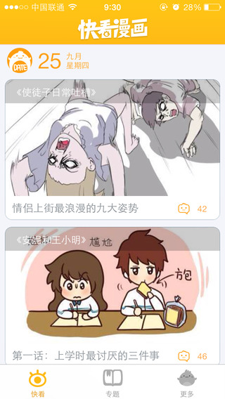 快看漫画是一款完全适配手机阅读体验的漫画APP。操作非常简单,无需横屏或放大缩小,创新性条式排版,只需要手指一直往下滑,便可快速浏览,带给你舒适的视觉享受!