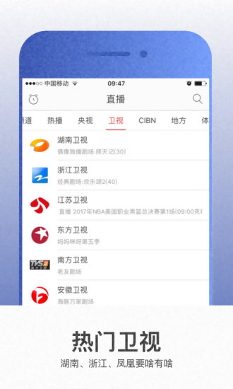 湖南卫视(芒果TV)、浙江卫视(中国蓝TV)、东方卫视、江苏卫视、北京卫视、广东公共、珠江电影、CIBN电影频道等电视直播频道齐全,随意观看!