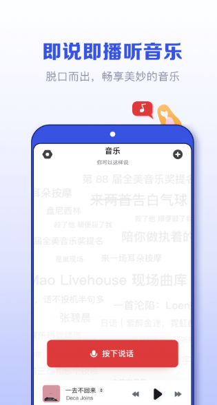 开放说法。相比其他助手,不再出现“我不明白你的意思”这种情况,无论用户怎么说,都会播放音乐。除了“来一首xxx的xxx”这种常规说法以外,也支持直接说歌名、歌手名,歌曲别名等,如:说“抖音”会直接播放抖音歌单、说“98K”会播放抖音98K配乐单曲HandClap、说“延禧攻略”或“灌篮高手片尾曲”等,都可即刻完成指令。