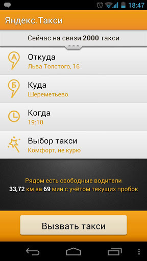 Yandex.Taxi The app lets you order a taxi and get on your way as quickly as possible (10 minutes on average) from anywhere in Moscow without even having to call the operator. Yandex has around 2,500 taxi drivers on constant standby, while your order is issued to the available drivers nearest to you. - Forget about ringing around endless taxi firms, your order will be sent directly to all our service partners*.- Your order will be sent to the taxi drivers nearest to you to ensure you get your taxi as soon as possible.- Select the most suitable price or company, and the app will automatically find a matching car.- Track the location of your cab on the map so you don't need to guess where it is or where the car parked.- Rate the service quality at the end of your trip, this will be used to rate each driver and improve our service. * Yandex.Taxi partners: Taxi-Ritm, Taksik, Taxi@SMS, Taxi Pilot, GLOBUS TAXI, XXL-TAXI, NowTaxi, Glavavtoprokat, CityMobil, Megapolis taxi, Taxi#1, Stolichnyi kucher, Taxi Soyuz, Millenium Taxi, Formula taxi, Buket taxi.