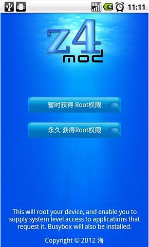 z4root是由xda上的一位加拿大开发者开发的,功能相当强大,基本适配所有设备,是1相对安全的root,主界面上面有三个选项,“获取临时ROOT权限”“获取永久ROOT权限”“清除ROOT文件”。用户可以 自行选择,一般选择永久获取比较多。不用怕root后机器变砖的危险,目前是网络上最流行的安卓系统手机一键root工具,发布以来,很多使用安卓手机的用户摆脱了手机垃圾软件的骚扰,一般水货手机或者国产手机都会内置很多垃圾软件,例如杀毒软件都会同时有360手机卫士和QQ安全管家,这样就造成了手机一开机就会自动运行,但z4root出现解决了这问题。