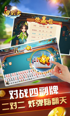 平阳四副头是一款四副牌、四人竞赛斗地主游戏,是一款流行于浙江温州平阳县的扑克游戏,一般采用四副扑克牌、四人竞赛、二打二的打法,具有规则简明、对抗性强等特点。同城游二打二的打法体现了竞赛者与队友合作并存的打牌技巧,更加增强了牌局的对抗性。