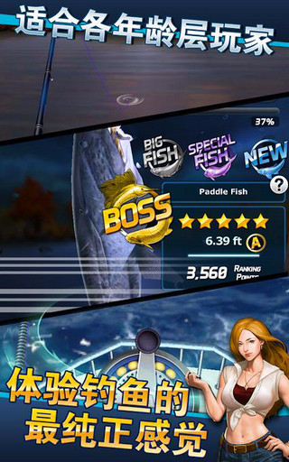 和大部分的钓鱼游戏类似,玩法也比较简单,点击屏幕底部中间的按钮抛线,如果能在蓝色区域则有大鱼属性加成,鱼上钩的时候屏幕正上方中间显示力量,你要是按得太大力是不仅“血条”会满,时间稍长会断线,最好的办法就是在快断线的时候马上松手,通过不断地“尝试”让鱼儿精疲力尽。而本作有两点创新,就是在鱼儿跳起的时候屏幕会提示你向左或向右划屏,“血条”下面的蓝色条为力量条,经过多次“搏斗”到蓝条满了向上划屏,即可“发大招”,加上游戏本身的入门教程做的很完善,掌握起来不难。