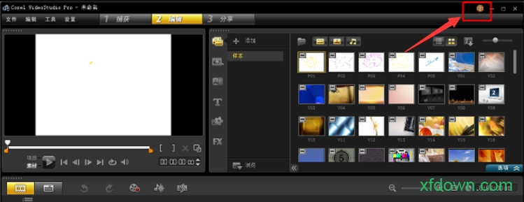 2、之后点击会声会影x5软件界面右上角如图所示位置的按钮;