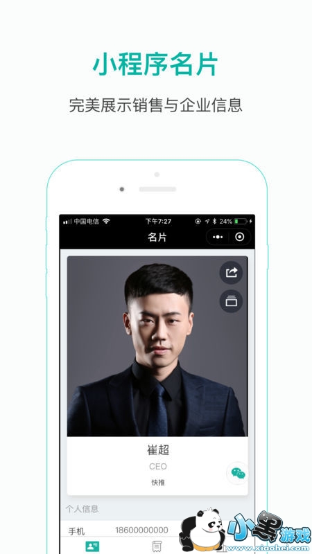 1、SCRM:领先的SCRM,简洁易用,点击快推智能名片小程序的客户都会自动录入到SCRM中,方便销售管理。