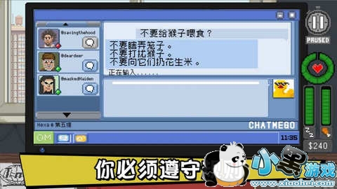 不要喂食猴子是一款玩法刺激的摄像头来监控的模拟类手游。该游戏上手简单,玩法丰富。在游戏中,玩家来到一家观察俱乐部扮演一名神秘人物,善于入侵各种网络以及摄像头,在这款游戏中你会遇到形形色色的人,这些人或许是在犯罪,或者是在做一些不好的事情,你是会选择举报这些人,暴露你的隐私,还是冷眼旁观看着这个事件发酵呢?