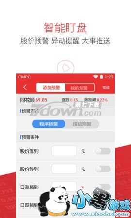4.智能盯盘,股价预警,异动提醒,大事推送,最新消息一手掌握。实时监控,离线盯盘,实时追踪大单资金流向,主力动向一目了然。