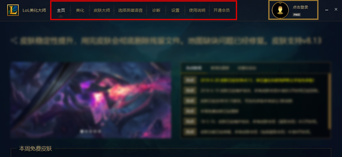 安装完成后打开桌面上的“LoL美化大师”会看到如上界面。红色框区域是功能导航,黄色框区域为账号信息。