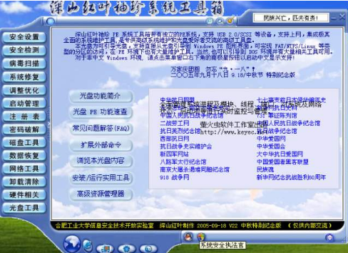 ① 标准 Windows 环境下,集成有多达 160 多种系统维护功能,囊括了安全设置、安全检测、安全扫描、注册表相关、系统修复、启动管理、系统调整、系统优化、加密解密、磁盘工具系列、数据恢复、网络检测、网络服务、网络其他相关工具、输入法、资源管理、卸载清除、硬件检测、BIOS相关、驱动程序相关、光盘及刻录相关等 20 多个类别的超强实用功能