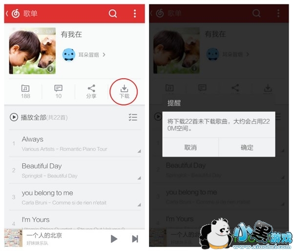看到歌单页面第二栏的四个选项了吗,最右边的那个下载图标就是下载歌单的按钮,选择后会提示你是否下载整个歌单,当然也会告诉你歌单的歌曲数量和总大小。