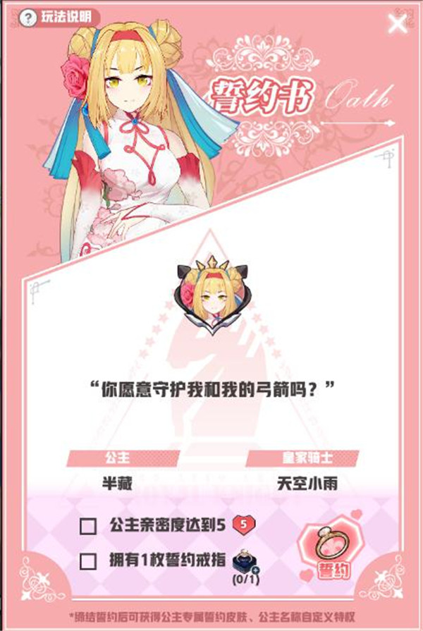 与公主达到5级亲密度后,同时拥有一枚誓约戒指,便可以与公主缔结誓约啦~缔结誓约后,可以获得公主专属誓约皮肤、公主名字自定义特权哦~~想好为自己的誓约公主取什么名字了嘛hahahha~~