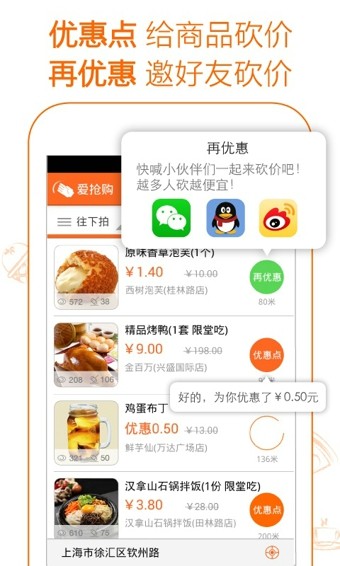 爱抢购V5.8.3大客户版是一款可以砍价的手机优惠购物省钱神器,全球首创砍价APP,自己砍价不过瘾,呼朋唤友一起砍。身边万家品牌商户随便砍,真的可以砍到底!1块钱就能吃快餐,喝咖啡,看电影,做SPA,日用商品也搞定。目前开放的城市有上海、北京、杭州、广州、南京、深圳、大庆、武汉、大连、济南、沈阳十一座城市,对这款软件感兴趣的朋友赶快点击下载试试吧~