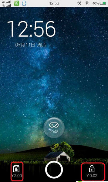 3.试着锁屏,如图所示,左边是邀请收益,右边则是划屏收益,有时还会出现分享收益(中间的是2048游戏,玩到高分再分享还有可能获奖哦)
