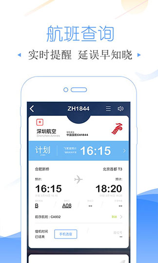 手机值机:提供国内、国际航线网上值机服务,让您提前选择心仪的座位。