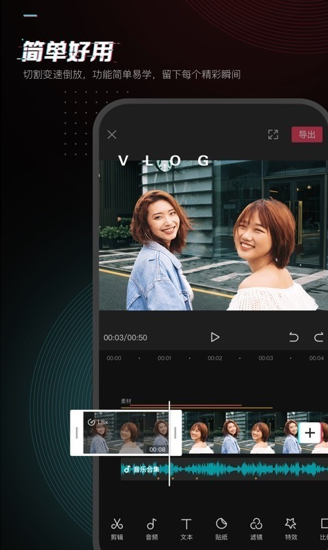 这是一款极简的视频编辑工具,让你轻松制作高逼格的vlog,就连软件本身也是体积小巧,没有花里胡哨的界面,直接将强大的编辑器呈现给你,并且简单好用,所有的功能简单易学,更有丰富的贴纸文本,独家背景音乐曲库,和超多素材,滤镜,特效等等内容,让每一个人都能制作出大片一样的精彩vlog。