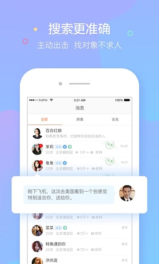 百合婚恋app是一款非常受欢迎且针对单身男女精心打造的婚恋交友软件,同时也是国内实名婚恋网开创者与领导者,集优质推荐、聊天交友、品质搜索、即时聊天、语音介绍功能于一体,更有新增说说地图引擎功能,全新的导航结构,为你推荐百里挑一的俊男美女,让恋爱变得简简单单,更加纯粹!而且,它还有独创的隐私保护机制,让用户的资料更安全;多项身份验证体系,让用户们交往更真诚;独特的心灵匹配系统,让婚宴更幸福。如果你还是单身,那你还等什么,一秒钟让你轻松邂逅你的有缘人,别让缘分从你身边悄悄溜走,让你开心找到你的知音伴侣。此外,还吸取移动社交工具的优点,不断强化互动功能。例如在婚恋交友类APP中,首创“说说”这一独特的板块,让会员可以随时随地分享图片和文字,抒发心情和感受。此外,“百合婚恋”还在推荐对象、通知提醒等方面不断优化,强化互动,提高用户活跃性。保持与主流技术同步,提升用户体验,对客户端的界面进行了扁平化处理,既做到了视觉效果上的紧跟潮流,也实现了用户操作的简单便捷,深受用户好评。