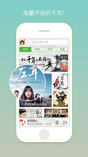 200,000小时有声内容,50,000部有声作品,汇聚评书相声、都市言情、武侠奇幻、儿童读物、幽默笑话等20个大类。