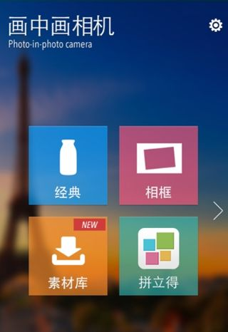 1、打开画中画相机 ,系统提供金典,素材,拼图相框等服务选项。
