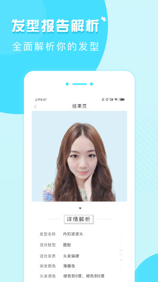 脸型分析:通过智能AI,大数据分析脸型,使用此功能能测试设别脸型的分类,分析脸型特征,专业数据解决发型设计与脸型搭配问题。