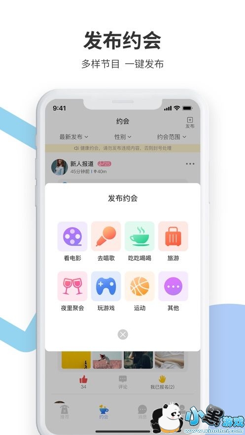 2、可以在线发布约会,发起邀约,选择自己喜欢的活动参加,线下交流更方便,让网友不再只是网友;