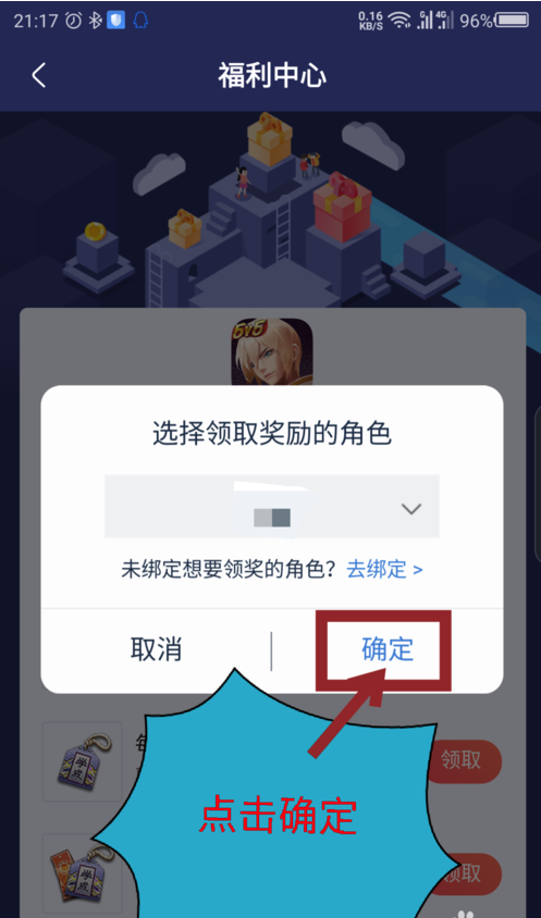 点击领取后,弹出一个窗口,选择要领取奖励的角色,选择好角色后,点击右边的确定。如图所示。