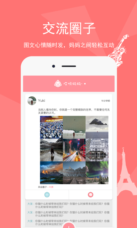 2、交流圈子,图文心情随时发,妈妈之间轻松互动。