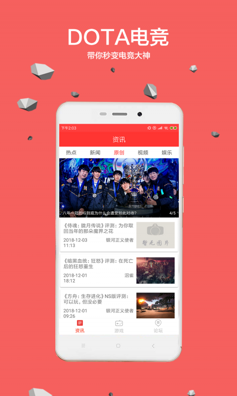 Dota电竞Apppcation是一款专为电子竞技打造的新闻阅读软件,用户可以通过Dota电竞Apppcation提供的内容更加清晰的了解各类游戏赛事,观看游戏直播,同时约上三五好友一起体验更多游戏的乐趣,同时你也可以将自己的游戏录制成视频分享给其他的游戏玩家,一起分享游戏技巧!